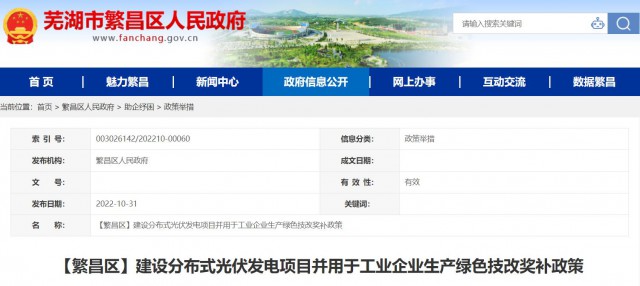 10月31日,安徽省蕪湖市繁昌區(qū)發(fā)布《建設分布式光伏發(fā)電項目并用于工業(yè)企業(yè)生產(chǎn)綠色技改獎補政策》,對“登記注冊地、稅務征管關系及統(tǒng)計關系在繁昌區(qū)范圍內(nèi),有健全財務制度、具有獨立法人資格、實行獨立核算,對區(qū)域節(jié)能減排降碳等領域發(fā)展作出積極貢獻的規(guī)上工業(yè)企業(yè)”進行政策獎補。