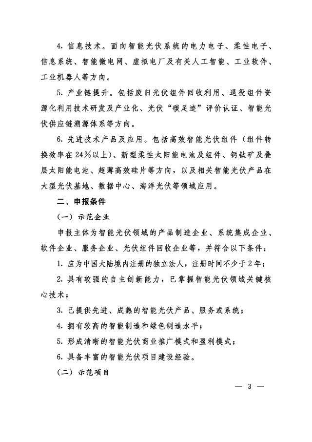 6.先進技術(shù)產(chǎn)品及應(yīng)用。包括高效智能光伏組件(組件轉(zhuǎn)換效率在24%以上)、新型柔性太陽能電池及組件、鈣鈦礦及疊層太陽能電池、超薄高效硅片等方向,以及相關(guān)智能光伏產(chǎn)品在大型光伏基地、數(shù)據(jù)中心、海洋光伏等領(lǐng)域應(yīng)用。