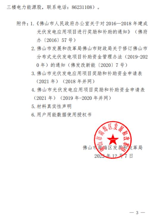 12月8日,廣東省佛山市南海區(qū)發(fā)改局發(fā)布《關(guān)于組織申報(bào)2021年度光伏應(yīng)用項(xiàng)目獎(jiǎng)勵(lì)和補(bǔ)助資金的通知》,2021年度光伏應(yīng)用項(xiàng)目獎(jiǎng)勵(lì)和補(bǔ)助資金申報(bào)將在佛山扶持通平臺(tái)上開展,請2018-2020年度建成并網(wǎng)的用戶根據(jù)本通知準(zhǔn)備相關(guān)材料,到佛山扶持通平臺(tái)上進(jìn)行申報(bào)。