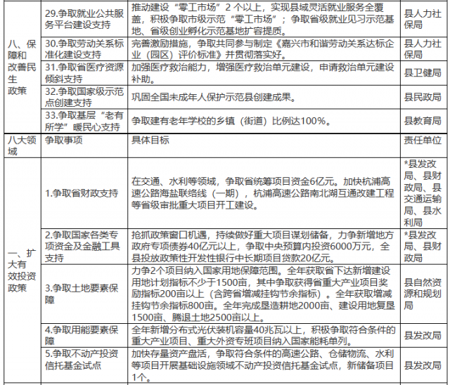 上述8個領(lǐng)域政策縣財政2023年預(yù)算安排資金,除交叉重疊部分外,支持總額約50億元。各領(lǐng)域政策縣級牽頭單位要根據(jù)文件要求,會同財政金融、自然資源、能源、人才等要素保障單位,抓緊出臺配套政策文件,及時做好政策的宣傳解讀、責(zé)任分解和落地實施,推動政策精準(zhǔn)滴灌、直達(dá)快享,確?;鶎佑懈小⑷罕姭@益、企業(yè)得利。