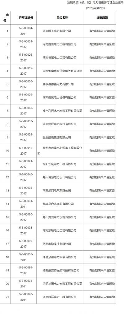 河南注銷21家未完成續(xù)期承裝(修、試)電力設(shè)施許可證企業(yè)