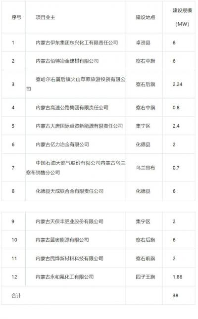 根據(jù)《內(nèi)蒙古自治區(qū)分散式風(fēng)電、分布式光伏發(fā)電項(xiàng)目三年行動計(jì)劃(2021-2023年)》(內(nèi)能新能字〔2021〕338號)文件精神,我委委托專業(yè)機(jī)構(gòu)對2023年分布式光伏發(fā)電項(xiàng)目進(jìn)行了優(yōu)選,經(jīng)委黨組研究決定,現(xiàn)將優(yōu)選結(jié)果予以公示。如有異議請?jiān)诠酒趦?nèi)以書面形式提出意見,并反饋烏蘭察布市發(fā)改委。
