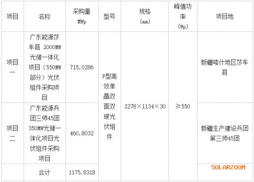 本次組件采購包括廣東能源莎車縣2000MW光儲一體化項(xiàng)目(550MW部分)光伏組件采購項(xiàng)目、廣東能源兵團(tuán)三師45團(tuán)350MW光儲一體化項(xiàng)目光伏組件采購項(xiàng)目的單晶雙面雙玻太陽能光伏組件及配套組串引出線用接插件、備品備件、專用工具和技術(shù)服務(wù),具體數(shù)量及要求如下:
