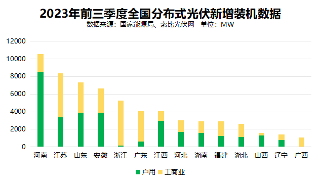 光伏發(fā)電方面,2023年前三季度,光伏新增裝機12894萬千瓦(128.94GW),同比增長145%,其中集中式光伏6180萬千瓦(61.8GW),分布式光伏6714萬千瓦(67.14GW),分布式光伏占比超過52%。分地區(qū)看,河南、山東、江蘇、湖北等11個省(自治區(qū)),前三季度光伏發(fā)電新增裝機超過5GW,其中7省的分布式光伏占比都超過一半。最高的河南省,分布式光伏占比超過98.6%,成為名副其實的“分布式光伏發(fā)展熱土”。