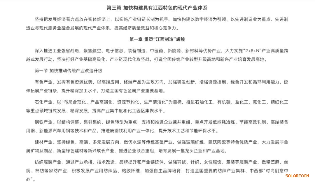 提升贛東北開放合作水平,提升“兩光一車”(光伏、光學、汽車)產(chǎn)業(yè)發(fā)展水平,打造全國光伏光學產(chǎn)業(yè)基地。加快贛西轉(zhuǎn)型升級步伐,支持新余推進鋼鐵、鋰電、硅灰石、光伏、電子信息等產(chǎn)業(yè)集群發(fā)展,打造中部地區(qū)新型工業(yè)強市、國家新能源科技示范城。