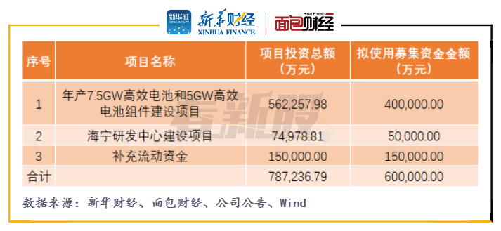 晶科能源此次擬公開(kāi)發(fā)行不超過(guò)26.67億股,發(fā)行股份數(shù)量不超過(guò)發(fā)行后總股本的25%,擬募集60億元投向年產(chǎn)7.5GW高效電池和5GW高效電池組件建設(shè)項(xiàng)目(以下簡(jiǎn)稱“高效電池及組件項(xiàng)目”)、海寧研發(fā)中心建設(shè)項(xiàng)目以及補(bǔ)充流動(dòng)資金。其中高效電池及組件項(xiàng)目擬使用募集資金金額為40億元,占此次擬募集資金總額的66.67%,是此次募資的主要投資項(xiàng)目。