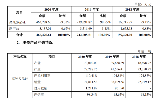 根據(jù)硅業(yè)分會數(shù)據(jù),2020 年度國內多晶硅產量約為 39.6 萬噸,該公司對應期間的多晶硅產量為 7.73 萬噸,占國內多晶硅產量的 19.52%;2020 年度國內單晶硅片用料產量為 32.6 萬噸,占國內多晶硅產量的 82.4%,該公司在占據(jù)主流的單晶硅片用料的市占率為 22.68%。