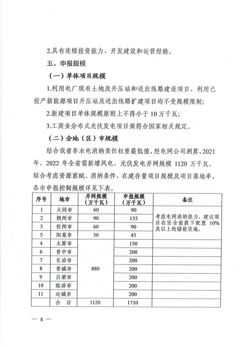 結(jié)合山西省非水電消納責(zé)任權(quán)重最低值,經(jīng)電網(wǎng)公司測算,2021年、2022年山西省需新增風(fēng)電、光伏發(fā)電并網(wǎng)規(guī)模1120萬千瓦。文件明確晉北三市暫不考慮風(fēng)電競配項(xiàng)目,其余地市風(fēng)光發(fā)電項(xiàng)目規(guī)模按2:8比例申報。