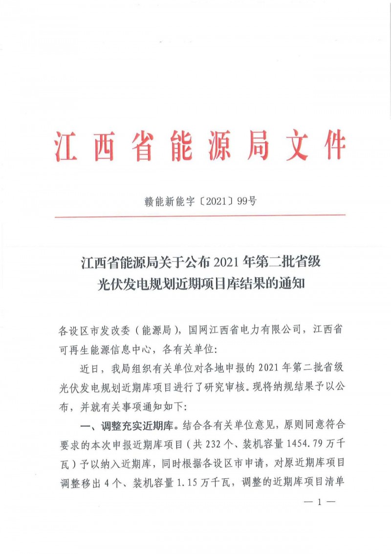 江西省2021年第二批光伏發(fā)電規(guī)劃近期庫調(diào)整納入項(xiàng)目共232個(gè)、1454.79萬千瓦項(xiàng)目,其中