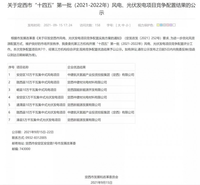 近日,甘肅定西市公布十四五”第一批(2021-2022年)風電、光伏發(fā)電項目競爭配置結果,根據文件,競爭配置風電、光伏發(fā)電項目7個,建設總規(guī)模600MW。其中,風電項目3個、建設規(guī)模300MW,光伏發(fā)電項目4個、建設規(guī)模為300MW。競爭配置風電、光伏發(fā)電項目配置儲能容量不低于風電、光伏發(fā)電項目配置容量的5%,配置風電、光伏發(fā)電項目與儲能設施必須于2022年11月底前全容量建成投產。其中,風電項目必須于2021年12月底前開工建設,光伏發(fā)電項目必須于2021年12月底前實現(xiàn)一半以上并網規(guī)模。
