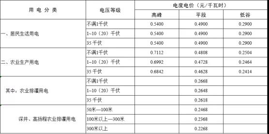 注:1. 上表所列價格,均含政府性基金及附加。其中,居民生活用電每千瓦時含國家重大水利建設基金0.403875分、大中型水庫移民扶持基金0.62分、可再生能源附加0.1分;農(nóng)業(yè)生產(chǎn)用電每千瓦時含國家重大水利建設基金0.403875分。2. 居民生活用電分時電價時段劃分:高峰時段8:00-22:00,低谷時段22:00-次日8:00。居民生活用電1-10千伏“一戶一表”價格在不滿1千伏“一戶一表”居民生活用電價格基礎上相應降低2分。3. 農(nóng)業(yè)生產(chǎn)用電分時電價時段劃分:尖峰時段19:00-21:00;高峰時段8:00-11:00、13:00-19:00、21:00-22:00;低谷時段:11:00-13:00、22:00-次日8:00。