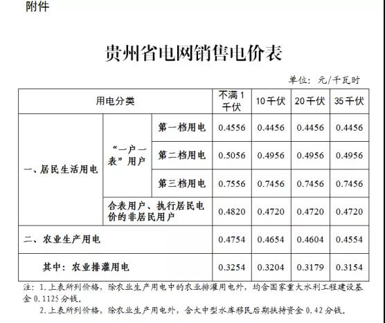 注:1、上表所列價格,除已摘帽貧困縣農(nóng)業(yè)排灌用電外,均含國家重大水利工程建設基金0.15525分錢。2、上表所列價格,居民生活用電含可再生能源電價附加0.1分錢,含大中型水庫移民后期扶持基金0.62分錢。
