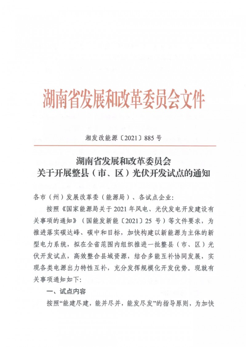 11月15日,湖南省發(fā)改委下發(fā)《關(guān)于開展整縣(市、區(qū))光伏開發(fā)試點(diǎn)的通知》,擬在全省范圍內(nèi)組織推進(jìn)一批整縣(市、區(qū))光伏開發(fā)試點(diǎn),高效整合縣域資源,結(jié)合多能互補(bǔ)協(xié)同發(fā)展。