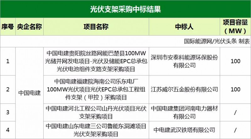 光伏支架采購入圍企業(yè)有深圳市安泰科能源環(huán)保股份有限公司、江蘇威爾五金股份有限公司、中國電建集團河南電力器材有限公司、中電建武漢鐵塔有限公司。