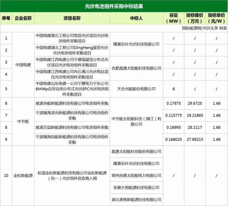 近日,中國電建、中節(jié)能、金松新能源發(fā)布光伏電池組件、光伏逆變器、光伏支架等項目中標結(jié)果公告。規(guī)模合計為212.6325MW。