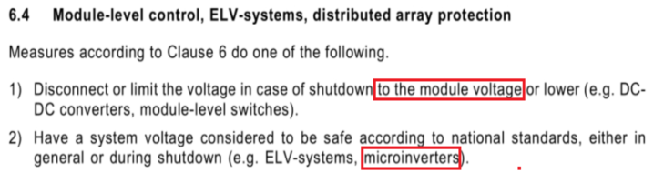 規(guī)范每三年更新一次,在全美范圍內(nèi)有效,但不同的州可執(zhí)行不同版本的規(guī)范。在最新版的NEC2020文件中要求:以距離到光伏矩陣305mm為界限,界限范圍外,在觸發(fā)設(shè)備啟動后30S內(nèi),電壓降低到30V以下,界線范圍內(nèi),要求具有“光伏危險控制系統(tǒng)”,或在觸發(fā)設(shè)備啟動后30S內(nèi),將電壓降低到80V以下,也就是要求實現(xiàn)“組件級關(guān)斷”。