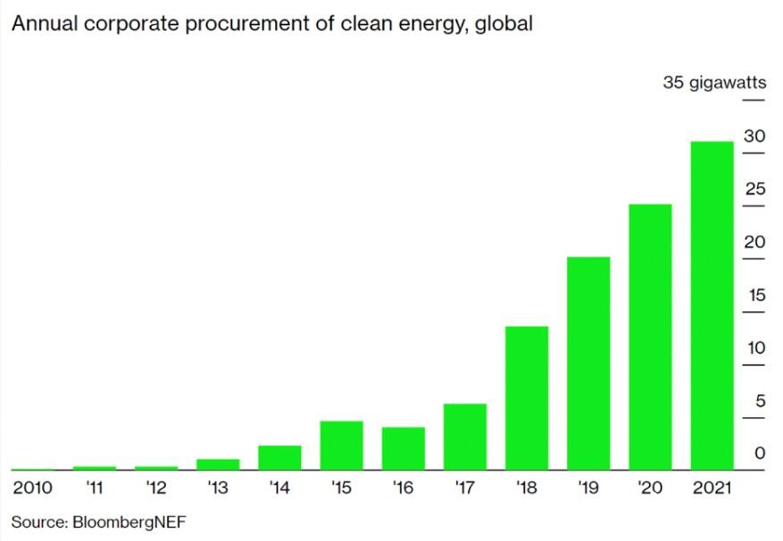 2021年有 67 家公司加入了 RE100(100%可再生能源倡議),總計(jì)有 355 家公司承諾使用 100% 可再生能源。2021年全球企業(yè)采購可再生能源合同的容量創(chuàng)下了 31GW 的新紀(jì)錄。其中大部分產(chǎn)能是在美洲采購的,其中 17GW 來自美國的企業(yè),3.3GW 來自北美和南美的其他國家的企業(yè)。