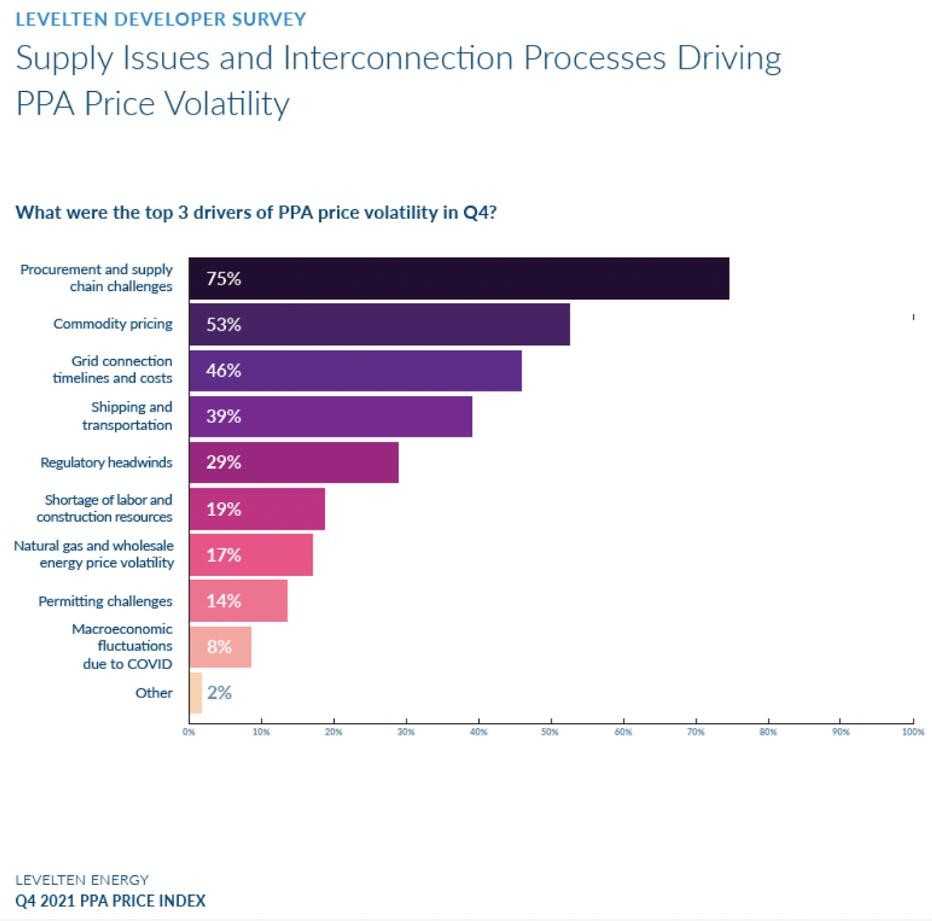 上述創(chuàng)紀(jì)錄的太陽能光伏的采購是在光伏成本上升的情況下發(fā)生的。LevelTen Energy的一項(xiàng)調(diào)查表明,由于需求增加、宏觀經(jīng)濟(jì)波動、供應(yīng)鏈問題以及其他因素的影響,光伏成本從 2020 年初開始上漲。據(jù)LevelTen Energy 的最新報(bào)告, 2021 年第四季度購電協(xié)議( PPA) 價(jià)格指數(shù)顯示光伏價(jià)格上漲了 5.7%,達(dá)到34.25 美元/兆瓦時(shí)。