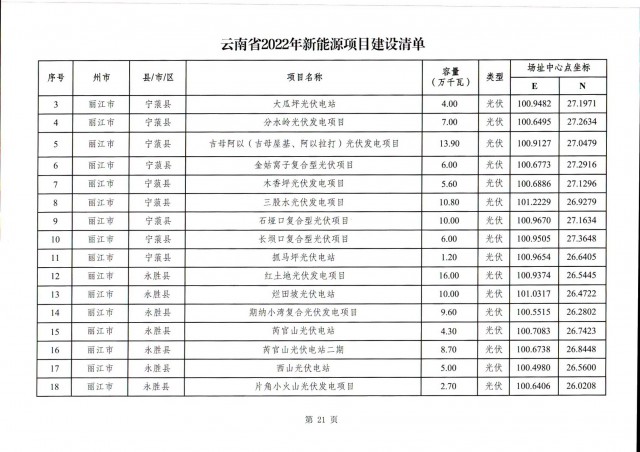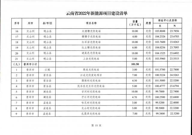 根據(jù)項目清單來看(附件查看清單),昆明市193.8萬千瓦、昭通市129.9萬千瓦、曲靖市440.6萬千瓦、玉溪市216.89萬千瓦、保山市194.8萬千瓦、楚雄州556.46萬千瓦、紅河州206.6萬千瓦、文山州231萬千瓦、普洱市101.5萬千瓦、西雙版納州91.5萬千瓦、大理州259.99萬千瓦、德宏州56.1萬千瓦、麗江市163.3萬千瓦、怒江州87.1萬千瓦、臨滄市271萬千瓦。