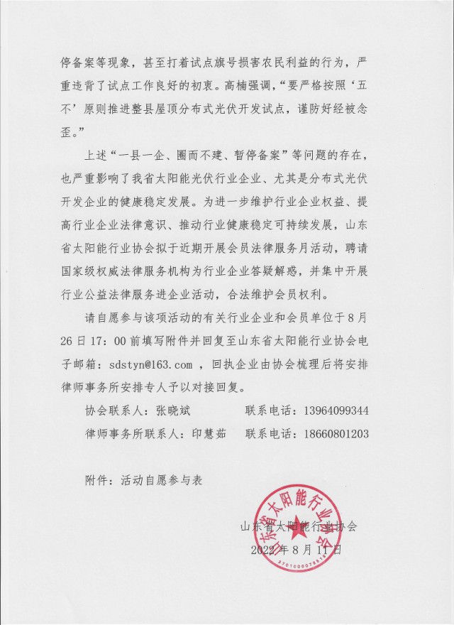 請(qǐng)自愿參與該項(xiàng)活動(dòng)的有關(guān)行業(yè)企業(yè)和會(huì)員單位于8月26日17:00 前填寫附件并回復(fù)至山東省太陽能行業(yè)協(xié)會(huì)電子郵箱:sdstyn@163.com,回執(zhí)企業(yè)由協(xié)會(huì)梳理后將安排律師事務(wù)所安排專人予以對(duì)接回復(fù)。