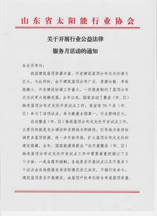 上述“一縣一企、圈而不建、暫停備案”等問題的存在,也嚴(yán)重影響了我省太陽能光伏行業(yè)企業(yè)、尤其是分布式光伏開發(fā)企業(yè)的健康穩(wěn)定發(fā)展。為進(jìn)一步維護(hù)行業(yè)企業(yè)權(quán)益、提高行業(yè)企業(yè)法律意識(shí)、推動(dòng)行業(yè)健康穩(wěn)定可持續(xù)發(fā)展,山東省太陽能行業(yè)協(xié)會(huì)擬于近期開展會(huì)員法律服務(wù)月活動(dòng),聘請(qǐng)國家級(jí)權(quán)威法律服務(wù)機(jī)構(gòu)為行業(yè)企業(yè)答疑解惑,并集中開展行業(yè)公益法律服務(wù)進(jìn)企業(yè)活動(dòng),合法維護(hù)會(huì)員權(quán)利。
