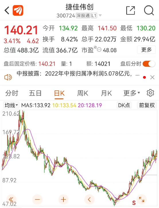 在公布減持計(jì)劃后,捷佳偉創(chuàng)股價(jià)在2021年8月23日達(dá)到歷史最高位210.62元/股。此后,股價(jià)便開啟回調(diào)模式。
