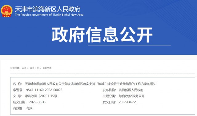 濱海新區(qū)落實支持“濱城”建設若干政策措施的工作方案的通知