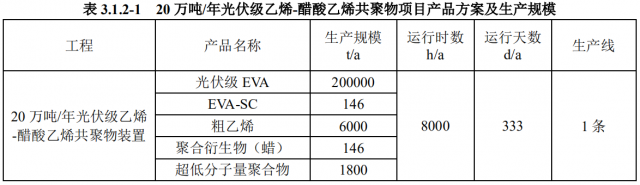 20 萬噸/年光伏級乙烯-醋酸乙烯共聚物項(xiàng)目具體產(chǎn)品方案及生產(chǎn)規(guī)模見下表。
