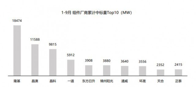 ?圖:據(jù)公開數(shù)據(jù)統(tǒng)計,2022年1-9月組件廠商累計中標(biāo)量(MW)