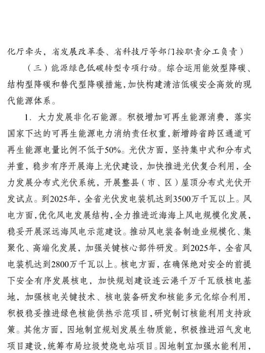 10月2日,江蘇省人民政府印發(fā)《江蘇省碳達(dá)峰實施方案》。文件提出,大力發(fā)展非化石能源。積極增加可再生能源消費,落實國家下達(dá)的可再生能源電力消納責(zé)任權(quán)重,新增跨省跨區(qū)通道可再生能源電量比例不低于50%.光伏方面,堅持集中式和分布式并重,穩(wěn)步有序開展海上光伏建設(shè),加快推進(jìn)光伏復(fù)合利用,全力發(fā)展分布式光伏系統(tǒng),開展整縣(市、區(qū))屋頂分布式光伏開發(fā)試點。到2025年,全省光伏發(fā)電裝機達(dá)到3500萬千瓦以上。風(fēng)電方面,優(yōu)化風(fēng)電發(fā)展結(jié)構(gòu),全力推進(jìn)近海海上風(fēng)電規(guī)?;l(fā)展,穩(wěn)妥開展深遠(yuǎn)海風(fēng)電示范建設(shè)。推動風(fēng)電裝備制造業(yè)規(guī)模化、集聚化、高端化發(fā)展,加強關(guān)鍵核心部件研發(fā)。到2025年,全省風(fēng)電裝機達(dá)到2800萬千瓦以上。核電方面,在確保絕對安全的前提下安全有序發(fā)展核電,加快規(guī)劃建設(shè)連云港千萬千瓦級核電基地,加強核電關(guān)鍵技術(shù)、核電裝備研發(fā)和核能多元化綜合利用,積極穩(wěn)妥推進(jìn)綠色核能供熱示范項目,研究制訂核能利用支持政策。其他方面,因地制宜規(guī)劃發(fā)展生物質(zhì)能,積極推進(jìn)沼氣發(fā)電項目建設(shè),統(tǒng)籌布局垃圾焚燒電站項目。因地制宜加強水能利用,科學(xué)推進(jìn)抽水蓄能開發(fā)。大力推進(jìn)光熱能、地?zé)崮?、空氣熱能等可再生能源的非電化利用,加快推動氫能研究與推廣應(yīng)用。力爭到2025年底全省生物質(zhì)發(fā)電裝機規(guī)模達(dá)到300萬千瓦。