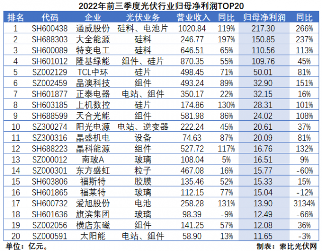 從營收規(guī)模來看,硅料和組件依然是創(chuàng)收能力最強(qiáng)的環(huán)節(jié)。而且,多數(shù)企業(yè)前三季度營業(yè)收入均已超過2021年全年,且創(chuàng)歷史新高。其中,通威股份營收規(guī)模首次突破千億大關(guān),達(dá)到1021億元;隆基綠能二、三季度邊際改善顯著,環(huán)比增速分別達(dá)到71%和15%,營收規(guī)模達(dá)到870.35億元;特變電工受益于硅料、煤炭產(chǎn)品的“量價齊升”,達(dá)到646.51億元。