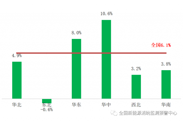 其中,三季度全國全社會用電量達到2.39萬億千瓦時,同比增長6.1%。三季度在穩(wěn)經(jīng)濟政策措施逐步落地以及持續(xù)大范圍極端高溫天氣等因素拉動下,用電量增速比二季度明顯回升,為新能源消納創(chuàng)造了良好條件。其中,7-8月全社會用電量增速較快,同比分別增長6.25%和10.7%,9月全社會用電量與去年同期持平。分地區(qū)來看,華中、華東地區(qū)三季度用電增速高于全國平均水平。