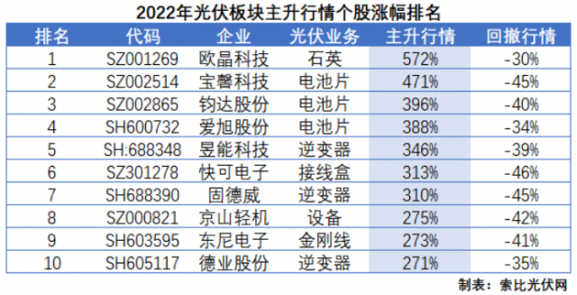 個(gè)股方面,次新、電池片以及逆變器漲幅居前。其中,年內(nèi)上市的“石英坩堝第一股”歐晶科技、微逆龍頭昱能科技、接線盒翹楚快可電子漲幅分別達(dá)到572%、346%和313%;跨界HJT和TOPCon的寶馨科技和鈞達(dá)股份漲幅分別達(dá)到471%和396%,主打ABC電池技術(shù)路線的愛旭股份漲幅達(dá)到388%;光儲(chǔ)逆變器頭部廠商固德威和德業(yè)股份漲幅分別達(dá)到310%和271%。