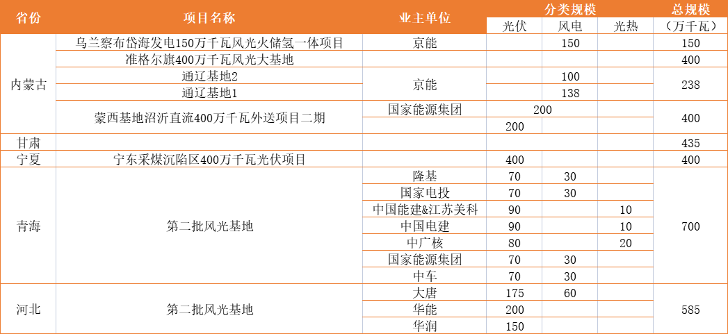 說明:上述數據通過公開信息整理,各企業(yè)數據存在未明確項目,具體以企業(yè)官方數據為準。此外,大基地存在聯合體業(yè)主,本表數據以牽頭企業(yè)為主。