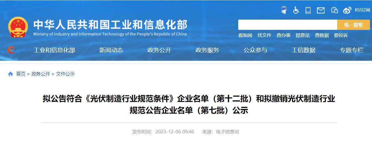 12月6日,工信部發(fā)布擬公告符合《光伏制造行業(yè)規(guī)范條件》企業(yè)名單(第十二批)和擬撤銷(xiāo)光伏制造行業(yè)規(guī)范公告企業(yè)名單(第七批)公示文件。