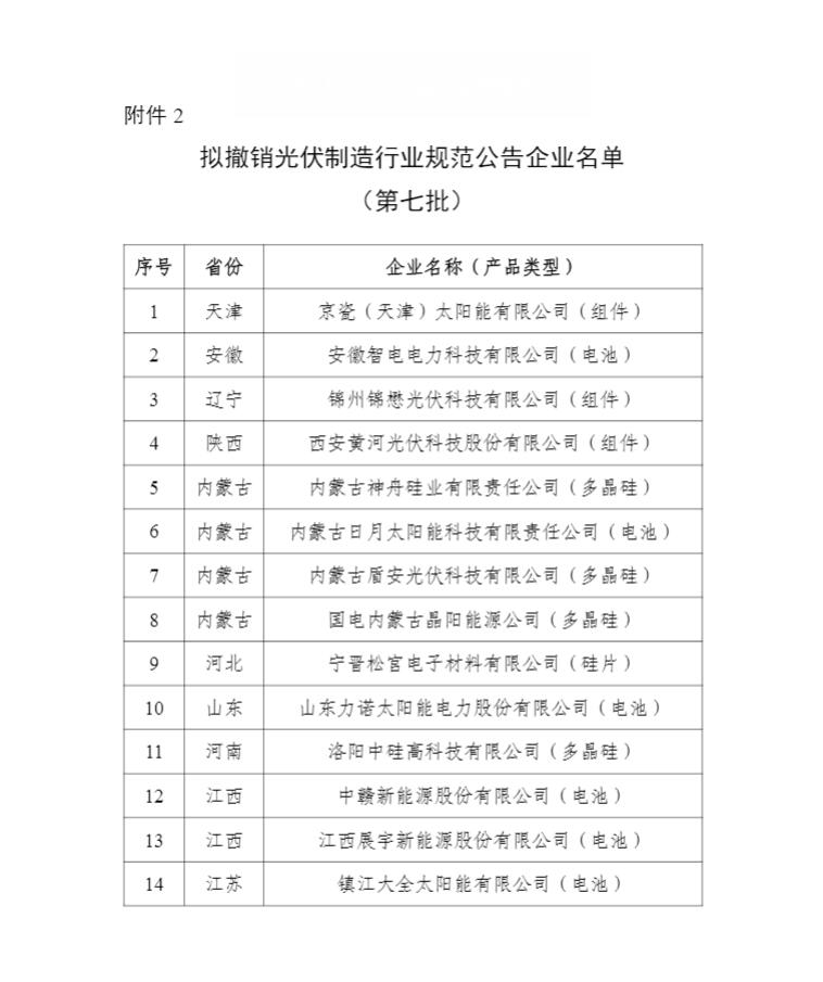 和擬撤銷(xiāo)光伏制造行業(yè)規(guī)范公告企業(yè)名單(第七批)公示
