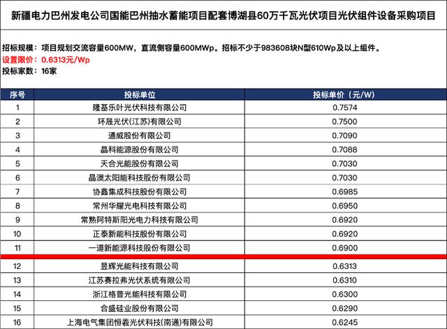 記者了解到,上述采購項(xiàng)目的投標(biāo)企業(yè)共有16家,11家企業(yè)報出了高于或與0.69元/W持平的價格。其中,隆基綠能旗下的隆基樂葉給出了0.7574元/W的最高報價,一道新能的報價為0.69元/W,與協(xié)會最近一次發(fā)布的組件成本價一致。