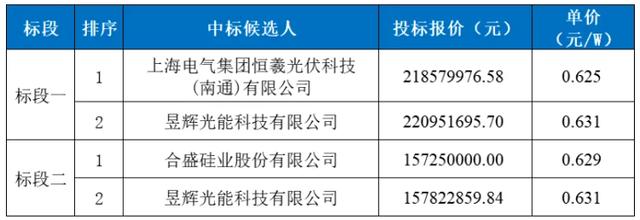 剩余5家企業(yè)報價則明顯低于光伏協(xié)會發(fā)布的組件成本價,報價范圍在0.6245元/W—0.6313元/W。上述采購項(xiàng)目兩個標(biāo)段的中標(biāo)候選人包括上海電氣集團(tuán)恒羲光伏科技(南通)有限公司、昱輝光能科技有限公司以及合盛硅業(yè)。