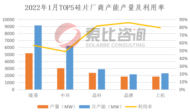 2022年1月,電池需求量明顯增加,國(guó)內(nèi)一線企業(yè)開(kāi)工率提升至7成。2022年1月國(guó)內(nèi)硅片產(chǎn)量20.6GW,環(huán)比增加15.4%。按照產(chǎn)量排名,隆基、中環(huán)、晶科、晶澳、上機(jī)位列前五,企業(yè)總產(chǎn)量14.34GW,占比69.61%,綜合利用率70.45%。預(yù)計(jì)2月份硅片產(chǎn)量將繼續(xù)增加。從供應(yīng)端來(lái)看,2月份基礎(chǔ)產(chǎn)量已達(dá)上限,受地震影響的部分產(chǎn)能加緊恢復(fù)。從需求端來(lái)看,終端需求遠(yuǎn)超預(yù)期、海外市場(chǎng)火熱,市場(chǎng)轉(zhuǎn)向供不應(yīng)求的局面。