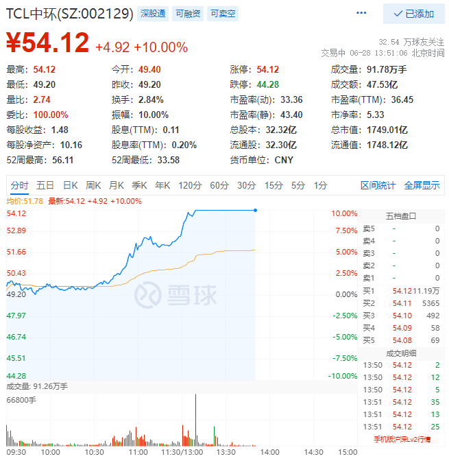 6月28日,TCL中環(huán)(SZ:002129)午后強(qiáng)勢漲停,股價(jià)報(bào)54.12元/股,總市值達(dá)到1749億元,距離歷史前高56.13元/股僅有咫尺之遙!自4月27日低點(diǎn)以來,公司股價(jià)漲幅達(dá)到61%!