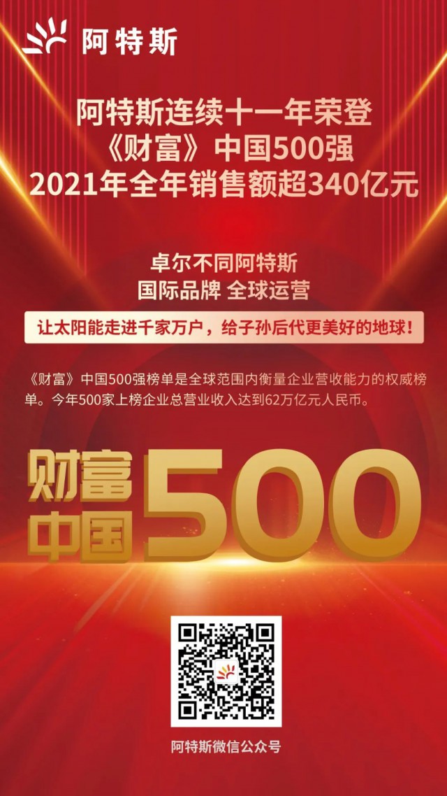 7月12日,財富中文網(wǎng)發(fā)布2022年《財富》中國500強(qiáng)排行榜,阿特斯陽光電力集團(tuán)憑借2021年340億元營收再次榮登榜單。這是阿特斯集團(tuán)連續(xù)第十一年上榜,充分彰顯了公司高質(zhì)量可持續(xù)發(fā)展的澎湃動力。