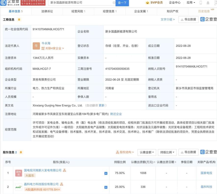 企查查股權(quán)穿透顯示,該公司由國電投河南新火發(fā)電有限公司、晶科科技共同持股。