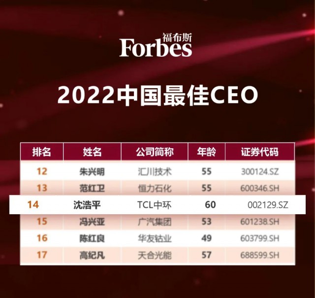 8月18日,福布斯中國發(fā)布2022中國最佳CEO榜,TCL中環(huán)總經理沈浩平入選,位列第14位。