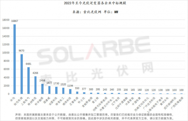 企業(yè)中標規(guī)模呈現(xiàn)“三足鼎立”的局面,逆變器企業(yè)“第一梯隊”劃分逐漸清晰,中標前三的華為、陽光、上能中標規(guī)模占總量的67%。其中,華為仍是中標“冠軍”,共拿下16.87GW大單,陽光電源中標9.67GW,上能電氣也拿到6.481GW訂單。