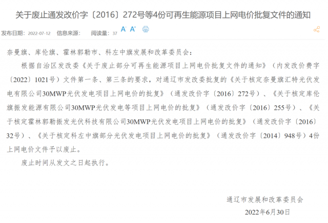 此前,太極實業(yè)(600667)8月4日晚間公告,公司關(guān)注到內(nèi)蒙古發(fā)改委官網(wǎng)刊登的《關(guān)于廢止部分可再生能源項目上網(wǎng)電價批復(fù)文件的通知》,涉及子公司五個集中式光伏電站;所涉電站將不再享受電費補貼,公司將對所涉電站評估后計提固定資產(chǎn)減值準(zhǔn)備,初步測算固定資產(chǎn)減值金額為3.28億元左右。該項固定資產(chǎn)減值預(yù)計將減少公司2022年上半年凈利潤3.28億元左右,占最近一期經(jīng)審計凈利潤的36.12%。同時,本次電價批復(fù)廢止將導(dǎo)致所涉電站電價補貼被取消,經(jīng)初步測算,預(yù)計減少公司2022年下半年光伏發(fā)電業(yè)務(wù)收入4906萬元左右,減少公司2022年下半年凈利潤4170萬元左右。