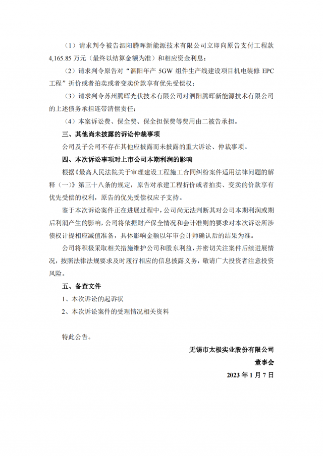 太極實(shí)業(yè)表示,鑒于本次訴訟案件正在進(jìn)展過(guò)程中,公司尚無(wú)法判斷其對(duì)公司本期利潤(rùn)或期后利潤(rùn)產(chǎn)生的影響,公司將依據(jù)財(cái)產(chǎn)保全情況和會(huì)計(jì)準(zhǔn)則的要求對(duì)本次訴訟所涉?zhèn)鶛?quán)計(jì)提相應(yīng)減值準(zhǔn)備,具體影響金額以年審會(huì)計(jì)師確認(rèn)后的結(jié)果為準(zhǔn)。值得注意還有,此前8月5日,太極實(shí)業(yè)子公司信息產(chǎn)業(yè)電子第十一設(shè)計(jì)研究院科技工程股份有限公司(以下稱(chēng)十一科技)位于烏蘭察布市、鄂爾多斯市、錫林郭勒盟發(fā)展改革委的五個(gè)光伏電站項(xiàng)目,共計(jì)裝機(jī)115 MW,因擅自變更投資主體,上網(wǎng)電價(jià)批復(fù)文件被廢止,其光伏補(bǔ)貼遭核查后恐退回,太極實(shí)業(yè)也將損失超3億凈利。