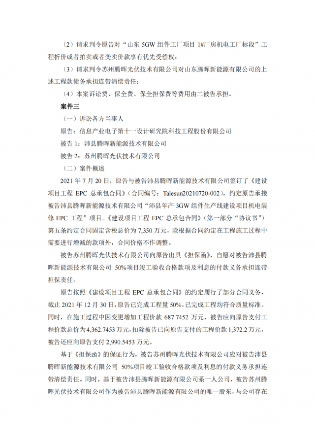 2020年~2021年期,十一科技與蘇州騰暉的六家全資子公司泗陽(yáng)騰暉光電有限公司、山東騰暉新能源技術(shù)有限公司、沛縣騰暉新能源技術(shù)有限公司、宿遷騰暉新能源技術(shù)有限公司、山東騰暉光電有限公司、泗陽(yáng)騰暉新能源技術(shù)有限公司簽訂了多筆項(xiàng)目施工承包合同,但上述六家企業(yè)并未全部付清工程款。