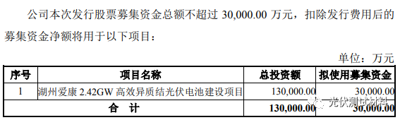 4月24日,愛康科技發(fā)布公告稱,公司擬向特定對(duì)象發(fā)行股票募資不超過3億元,扣除相關(guān)發(fā)行費(fèi)用后用于湖州愛康2.42GW高效異質(zhì)結(jié)光伏電池建設(shè)項(xiàng)目。