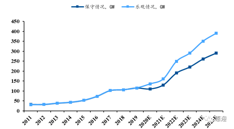 光伏行業(yè)降本提效穩(wěn)步推進(jìn),疊加全球各國可再生能源政策的頒布與執(zhí)行,預(yù)計(jì)全球光伏累計(jì)裝機(jī)容量將繼續(xù)保持增長態(tài)勢,根據(jù) CPIA 的預(yù)測,“十四五”期間,樂觀預(yù)期下,全球光伏裝機(jī)規(guī)模年均新增 287GW,中性情況下年均新增 222GW。該預(yù)期與 IRENA 于 2019 年年在分析報(bào)告《光伏的未來》給出的預(yù)測基本一致,IRENA 認(rèn)為,到 2030 年光伏的裝機(jī)目標(biāo)將達(dá)到 8500GW,年均光伏新增規(guī)模將超過 250GW。
