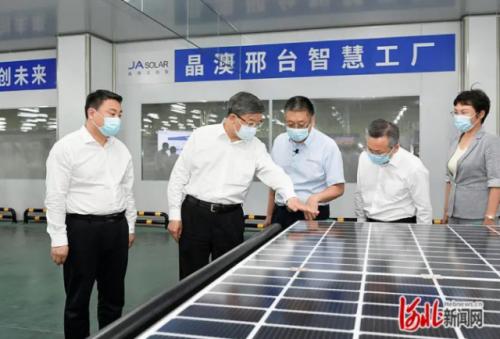 倪岳峰書記參觀了公司組件生產(chǎn)車間,聽取晶澳發(fā)展歷程和基地生產(chǎn)研發(fā)現(xiàn)狀,并深入了解邢臺基地智慧工廠的建設(shè)思路、發(fā)展規(guī)劃等情況。